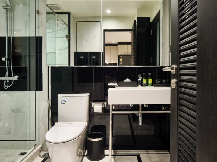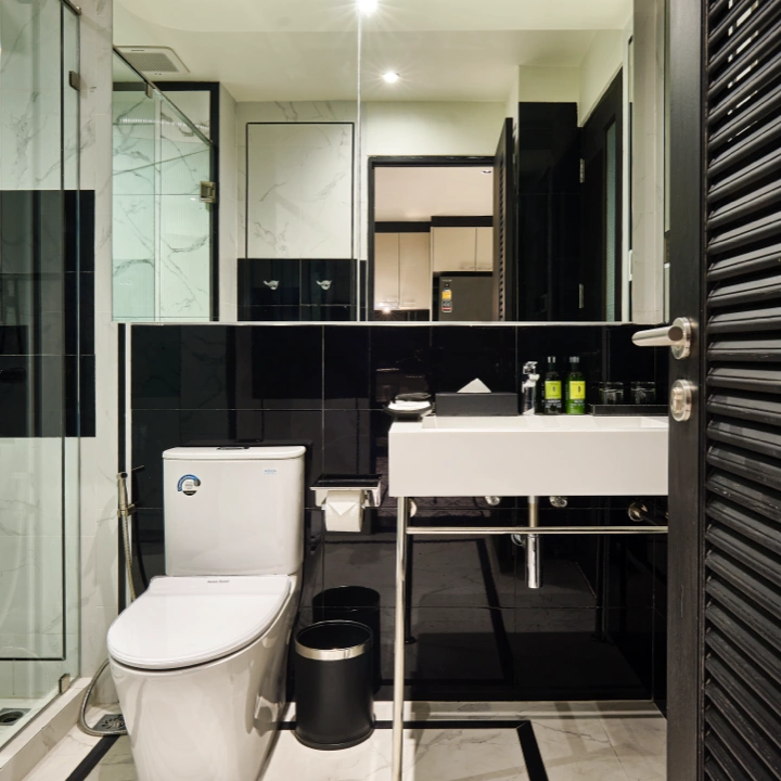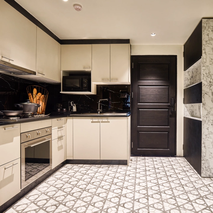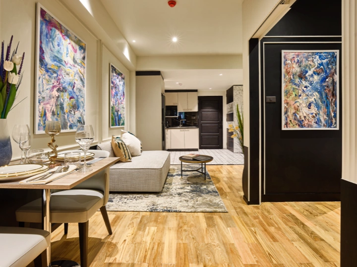 in the middle of the lively Sukhumvit area. Catering to both short- and long-term stayers, our centrally located boutique hotel Bangkok offers four room types. While they differ in size and kitchen equipment, all our suites are spacious and homey. Hardwood floors add rusticity, and chromium tones and sleek gray hues keep an eye on modernity.